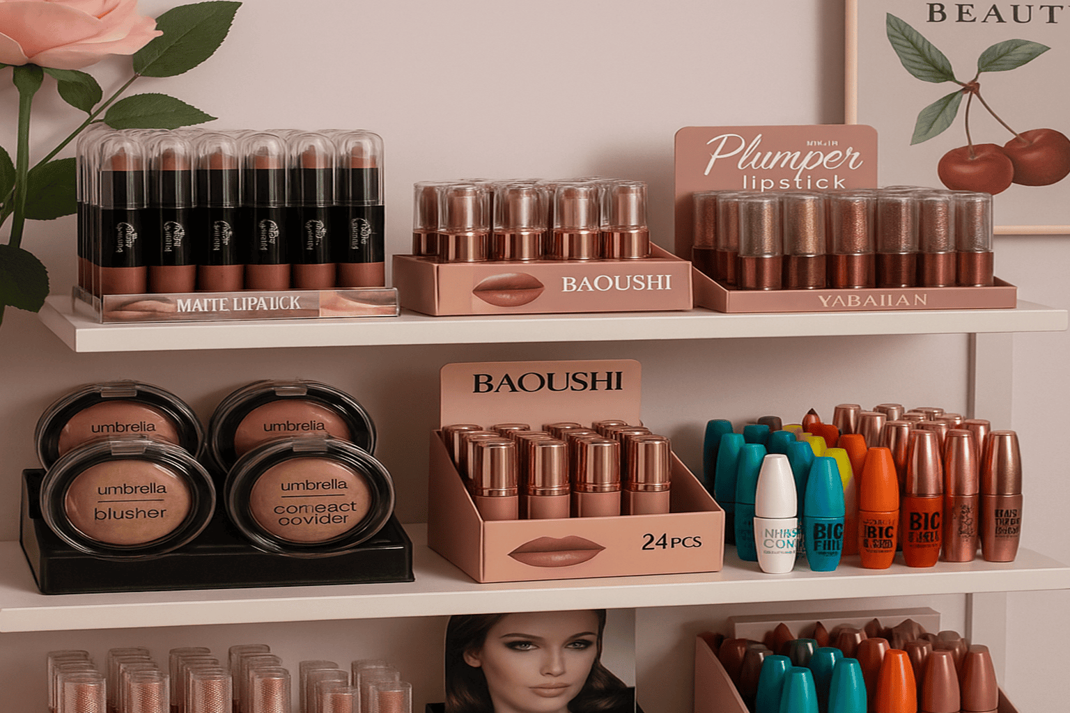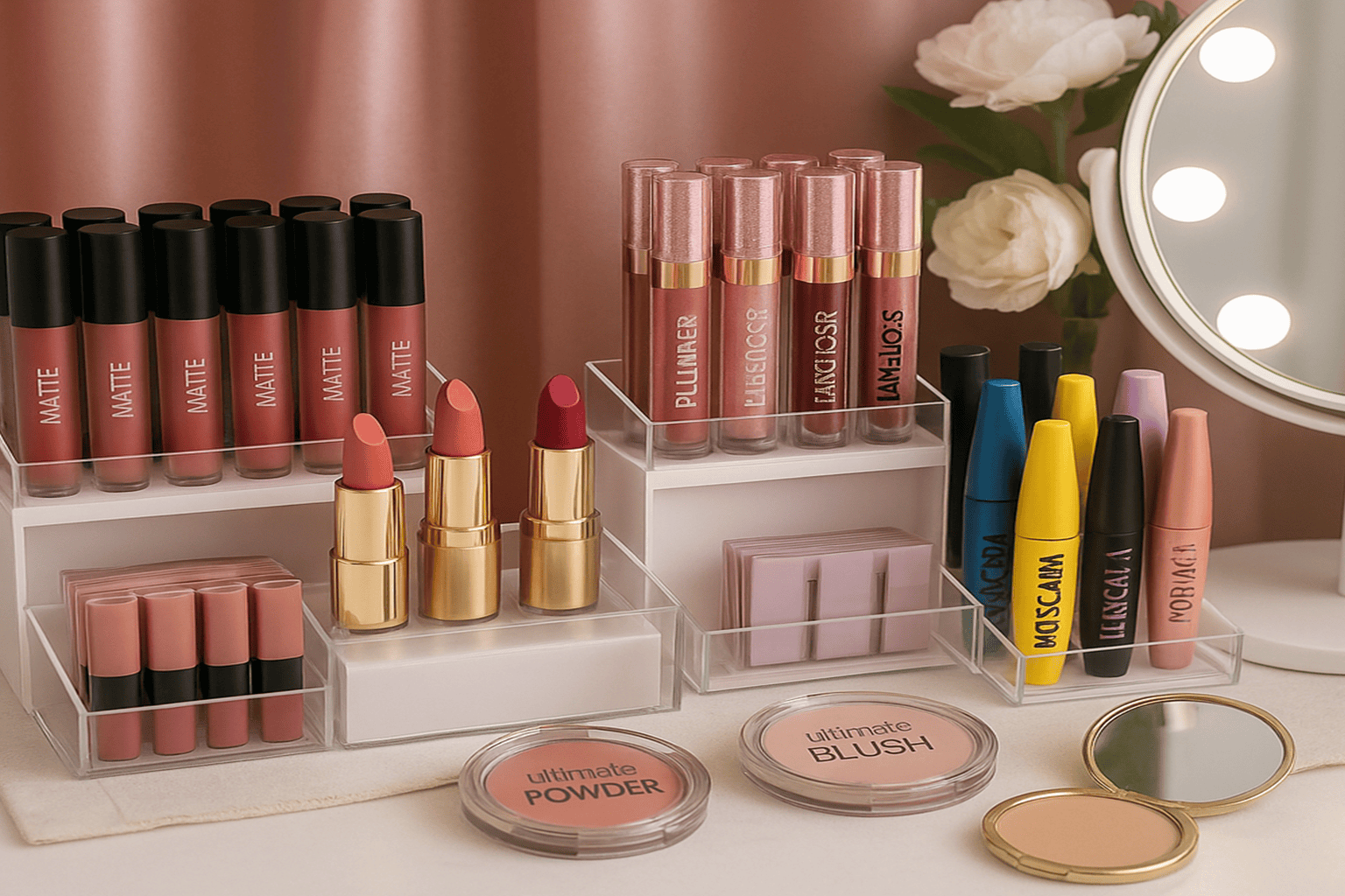 Κραγιόν, μάσκαρα, πούδρες και βασικά είδη μακιγιάζ, ιδανικά για γρήγορη και εύκολη περιποίηση στο σπίτι.